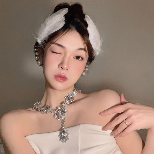 Feather Hair Clip / Faux Pearl Crawler Earring / Faux Crystal Alloy Lariat Necklace / Set