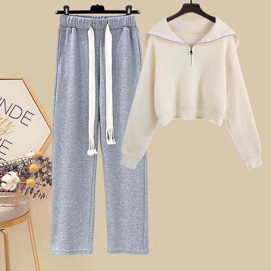 Pure Color Turtleneck Cable Sweater Wide Leg Pants Set