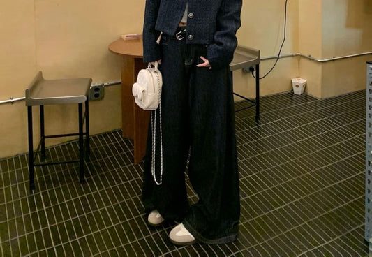 Crew Neck Plain Button-Up Tweed Crop Jacket / Mid Rise Washed Wide Leg Jeans