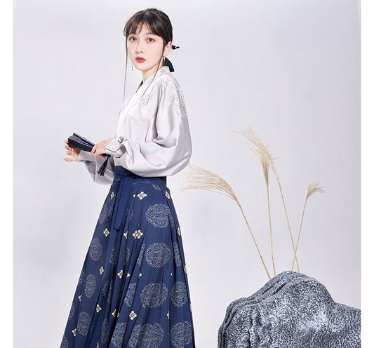 Puff-Sleeve Floral Jacquard Hanfu Top / High Waist Printed Pleated Midi Ma Mian Skirt / Set
