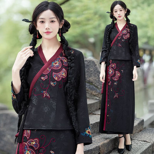 Traditional Chinese Long-Sleeve Stand Collar Plain Floral Jacquard Button-Up Top / High Rise Print Pleated Maxi A-Line Skirt