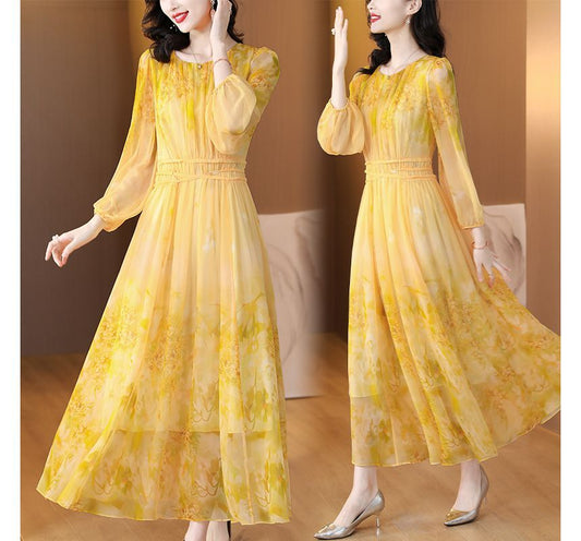 Long-Sleeve Crew Neck Print Maxi A-Line Dress