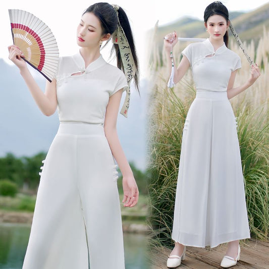 Traditional Chinese Short-Sleeve Stand Collar Plain Cutout Frog Buttoned Top / High Waist Cropped Culottes / Set
