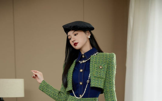 Fringed Trim Tweed Blazer / A-Line Skirt