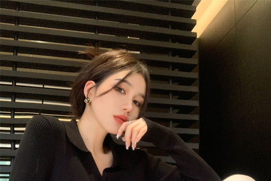 Long-Sleeve Collared Clasped Crop Knit Top OE34