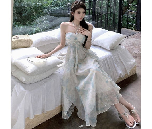 Set: Floral Embroidered Hanfu Maxi Dress + Long Light Jacket + Scarf + Fish Hanging Deco