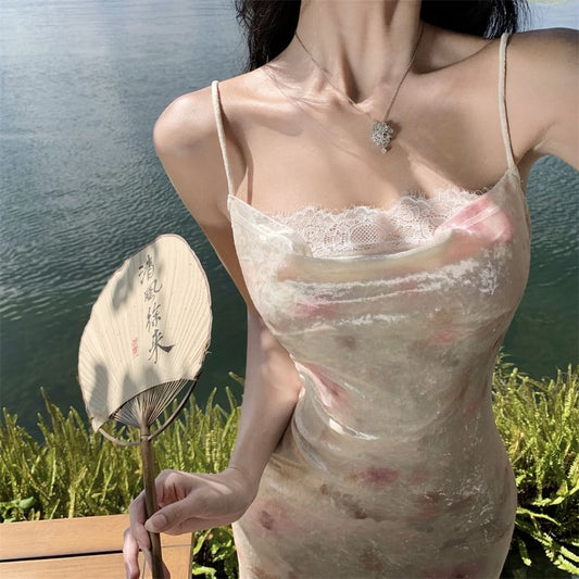 Spaghetti Strap Floral Print Lace Trim Midi Mermaid Dress