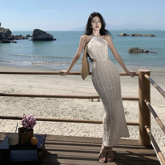 Halter Neck Plain Cutout Open Back Slit Lace Maxi Bodycon Dress