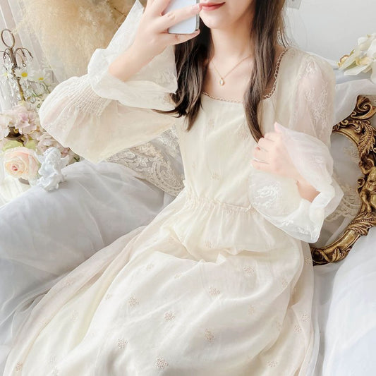Puff-Sleeve Square Neck Flower Embroidered Lace Trim Midi A-Line Dress