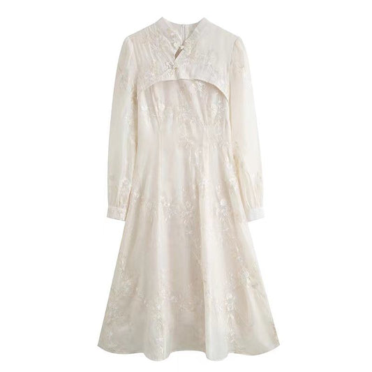 Long-Sleeve Band Collared Embroidered Midi A-Line Dress