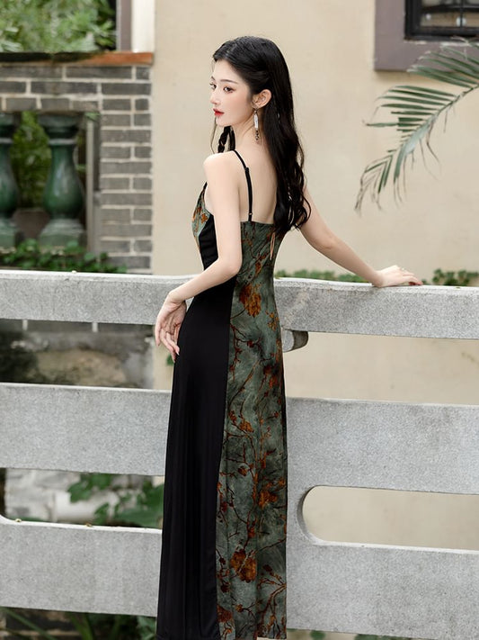 Set: Spaghetti Strap Floral Print Midi Bodycon Dress + Tasseled Cape