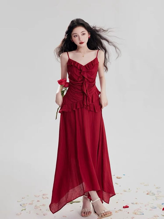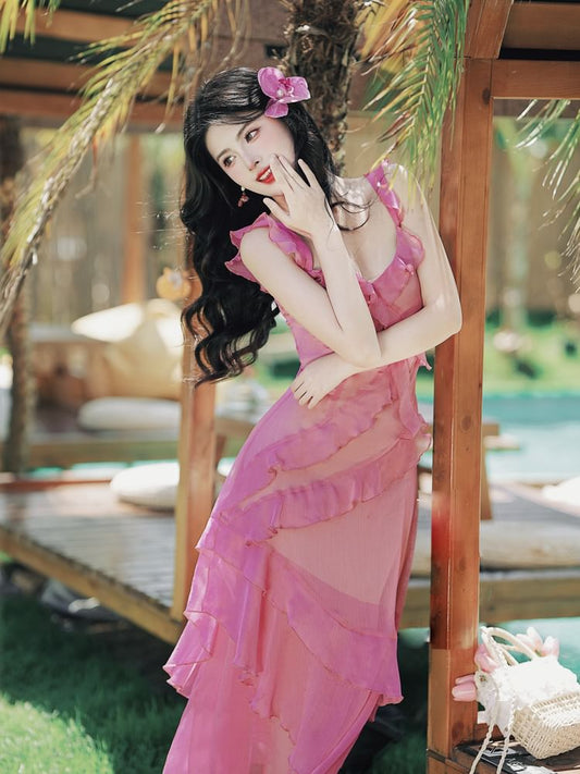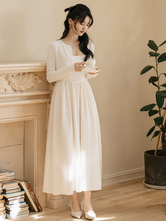 Spaghetti Strap Plain Ruffle Asymmetrical Maxi Sundress / Cardigan / Set