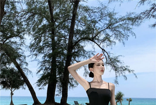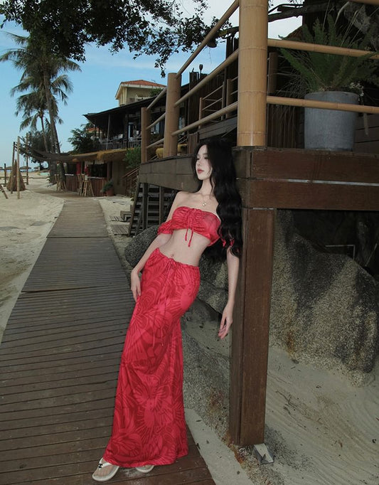 Halter Neck Plain Tie Waist Open Back Crop Top / High Waist Tie Dye Tie Side Maxi Straight Skirt / Set