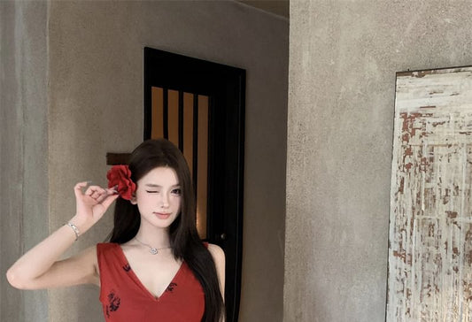 Set: Floral Crop Camisole Top + High Waist Midi A