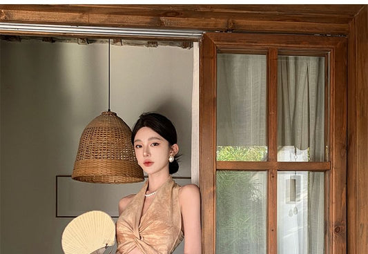 Set: Halter Print Twist Crop Tank Top + High Waist Culottes