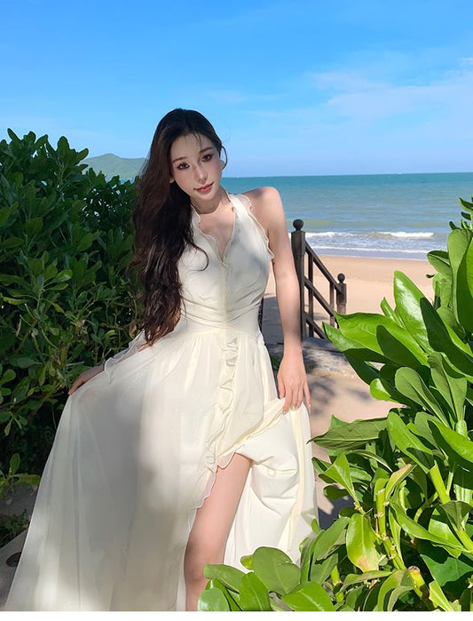Halter Plain Slit Ruffle Trim Maxi A