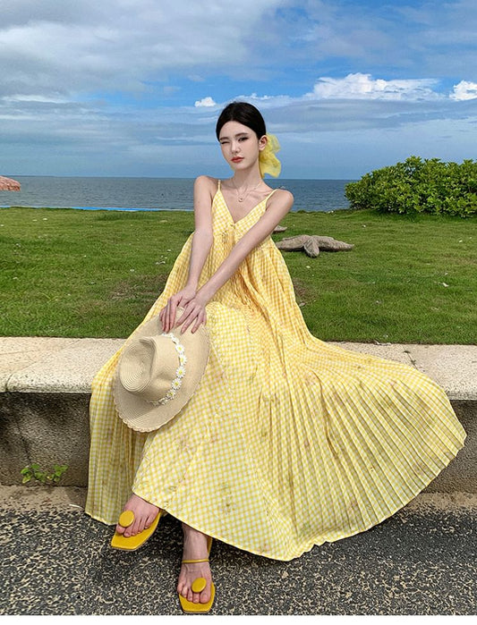 Spaghetti Strap Plaid Accordion Pleated Maxi A