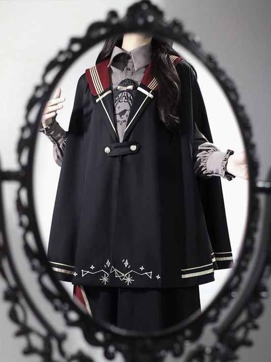Lolita Long-Sleeve Collared Bird Embroidered Pintuck Shirt / Cape / High Waist Panel Midi A-Line Skirt / Set