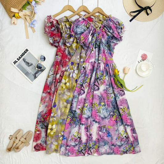 Cap-Sleeve V-Neck Floral Midi A-Line Dress