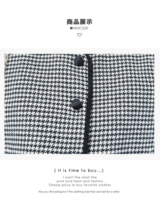 Crew Neck Houndstooth Tweed Double Breasted Cropped Jacket