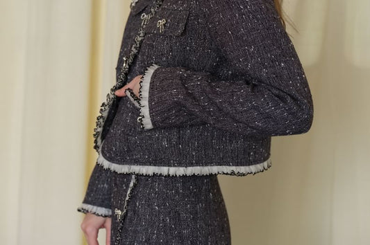 Frill Trim Button-Up Tweed Jacket / Asymmetrical Skirt