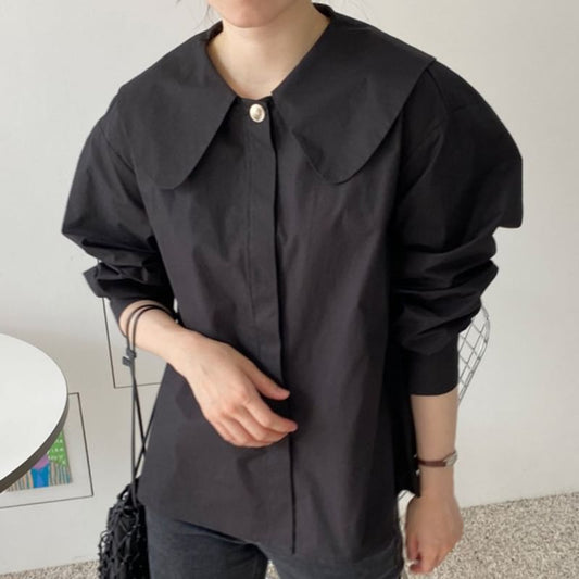 Long-Sleeve Button-Up Plain Babydoll Blouse