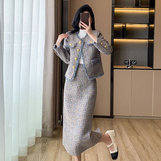 Set: Round Neck Fringed Tweed Button Jacket + High Waist Mini A-Line Skirt