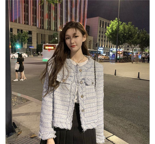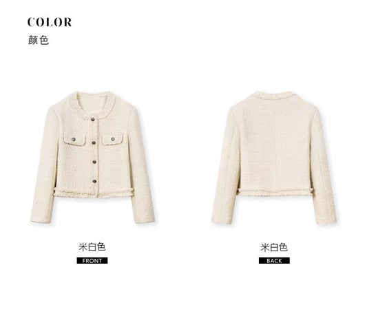 Short-Sleeve V-Neck Fringed Button-Up Plain Tweed Jacket