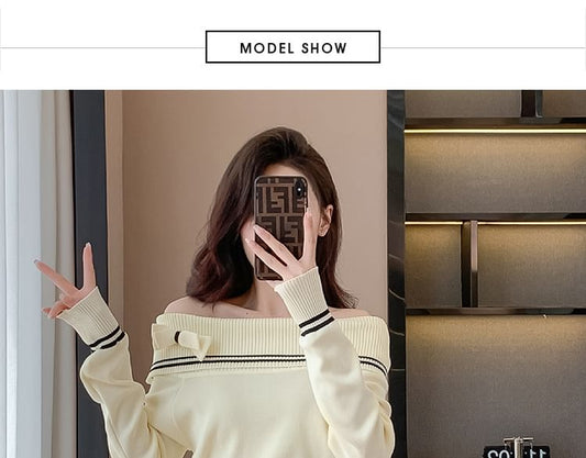Set: Off Shoulder Striped Sweater + Mid Rise Plain Mini Pleated Skirt
