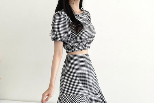 Set: Puff Sleeve Crew Neck Plaid Crop Top + High Rise Midi A-Line Skirt