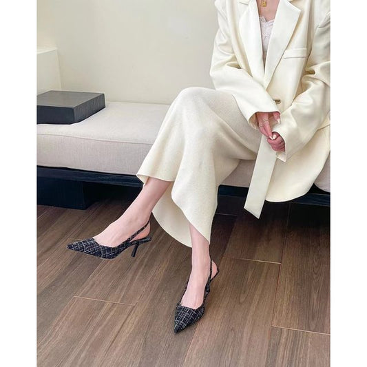 Pointed Plaid Slingback Kitten Heel Sandals BL20