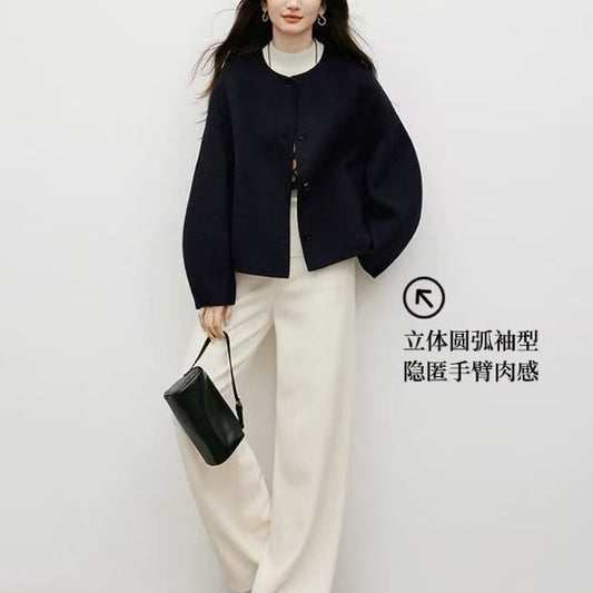 Long-Sleeve Double-Breasted Plain Woolen Coat