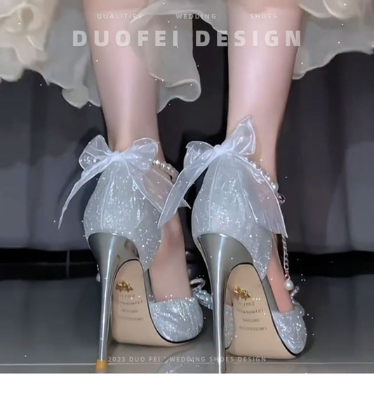 Glitter Ankle Sandals Bow Faux Strap Stiletto Pearl
