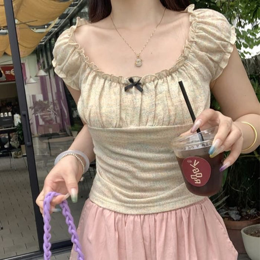 T-Shirt Trim Slim Fit Neck Short-Sleeve Ruffle Square Bow