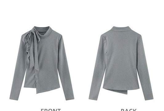 Plain Stand Long-Sleeve Collar T-Shirt Asymmetrical Button-Up