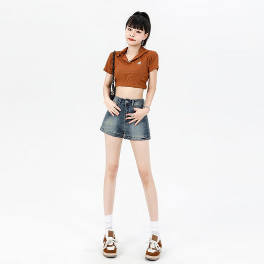 Washed Denim Waist High Hot Pants