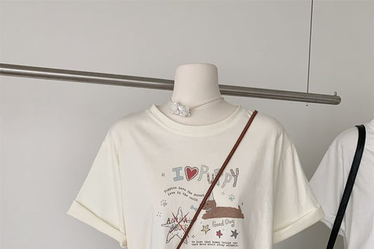 Neck Tee Cartoon Short-Sleeve Crew Print
