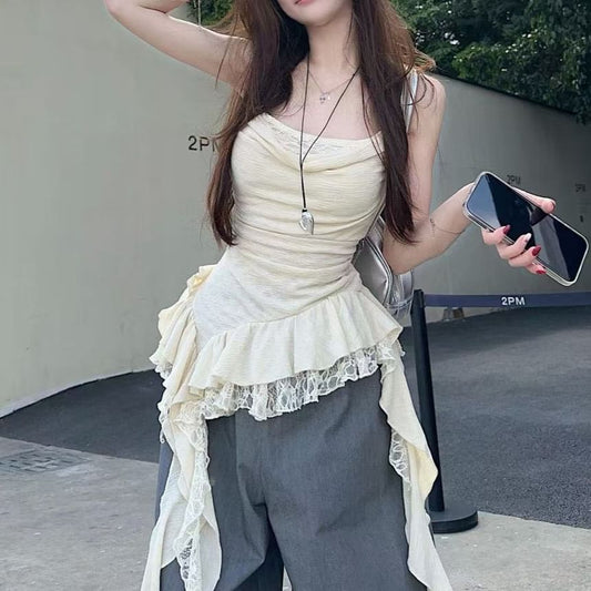 Hem Cowl Camisole Top Neck Lace Panel Asymmetrical Ruffle
