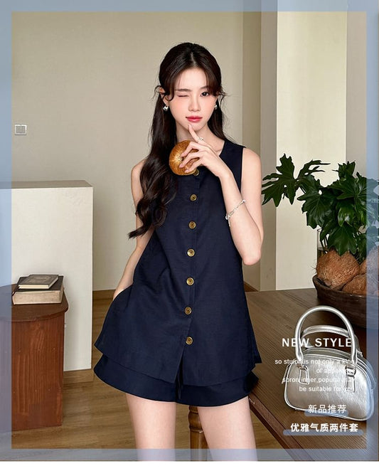 Set: Sleeveless Round Neck Plain Button Top + High Waist Shorts