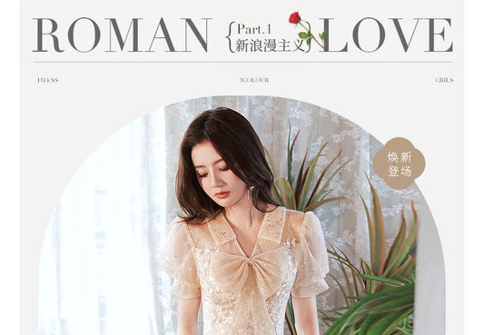 Short-Sleeve Collared Bow Sequin Beaded Mesh Midi A-Line Cocktail Dress
