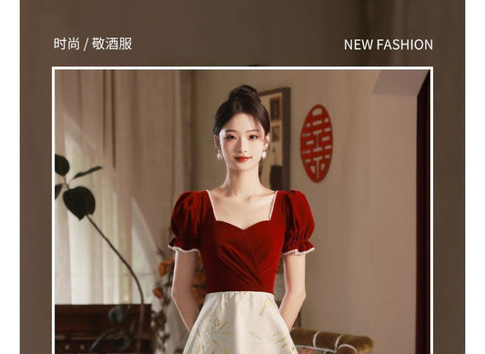 Short-Sleeve Mandarin Collar Floral Patterned Faux Pearl Midi A-Line Cocktail Dress
