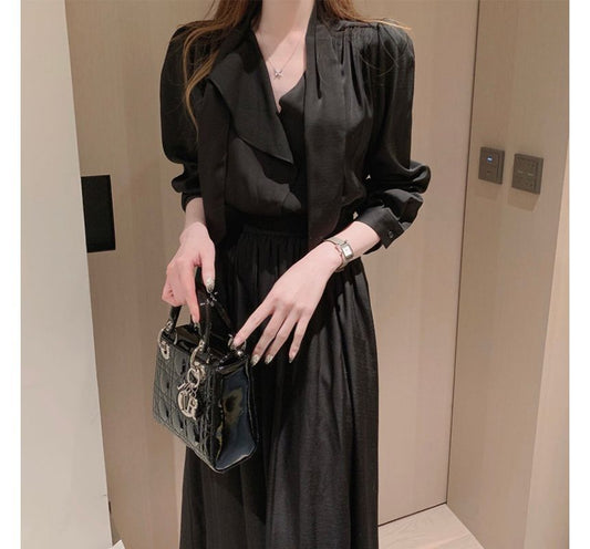 Long-Sleeve Tie-Neck Plain Midi A-Line Dress