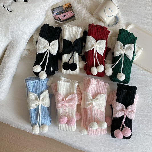 Two Tone Bow Pom Pom Ribbed Knit Leg Warmers