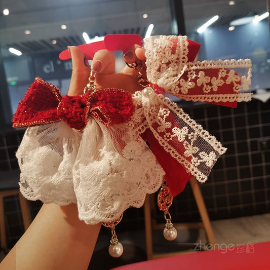 Lace Bow Faux Pearl Wrist Phone Strap with Lanyard Pad