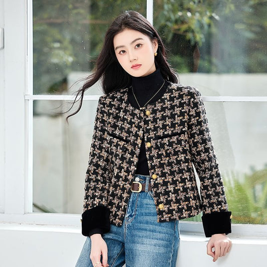 Crewneck Plaid Tweed Button-Up Jacket