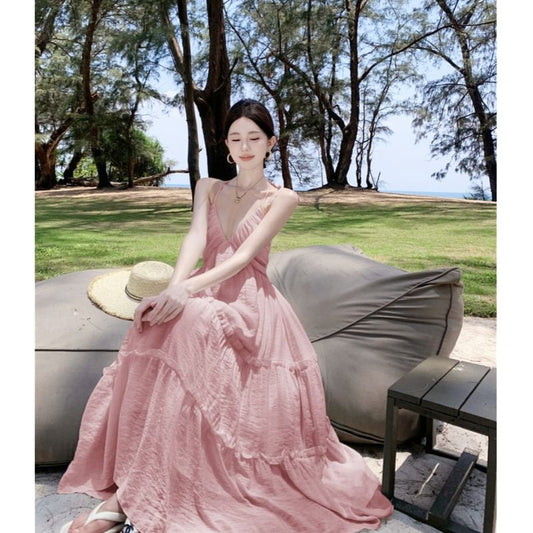 Spaghetti Strap V-Neck Plain Shirred Midi Sundress