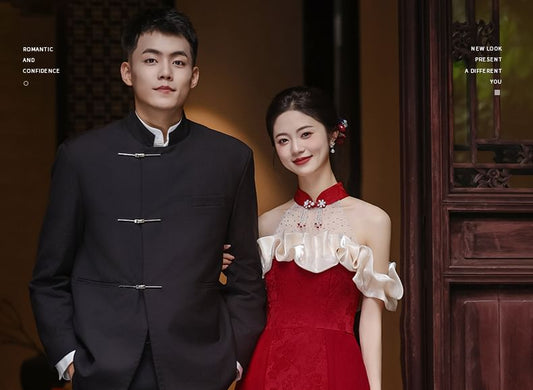 Cap-Sleeve Jacquard Beaded Tassel Midi Chinese Wedding Qipao Dress