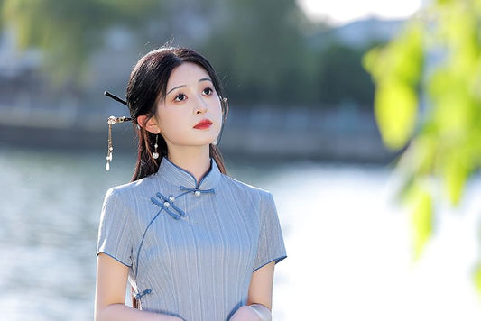 Short-Sleeve Stand Collar Striped Frog Buttoned Slit Midi Sheath Qipao