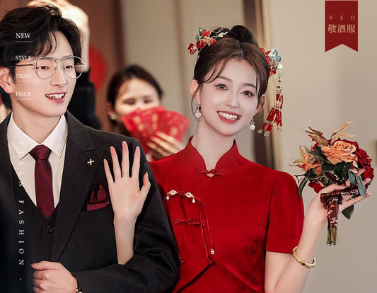 Short-Sleeve Slit Sequin Midi Chinese Wedding Qipao Dress