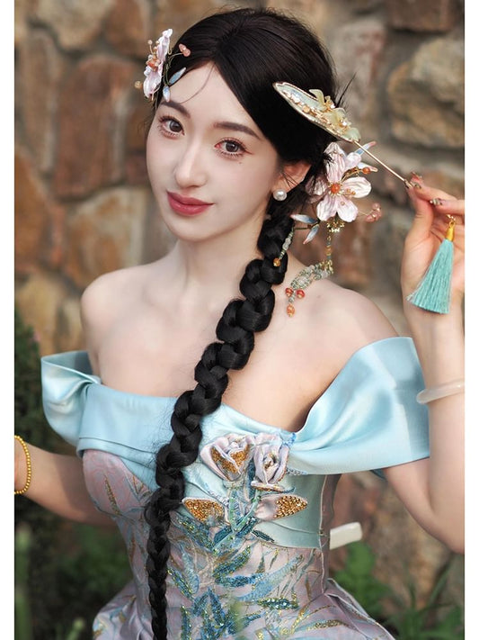 Sleeveless Floral Printed Slit Maxi Qipao / Plain Light Jacket / Set